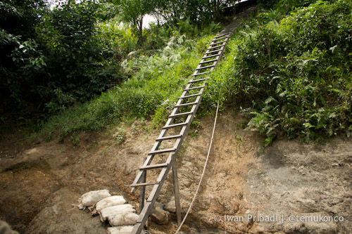 Wah itu tangga jadi permanen ya.. Apa gak sebaiknya bagian bawah yg gak tersangga tanah dikasi kayu biar kokoh. Atau dibuat undak2an aja? (wooo malah ngomentari tangganya)