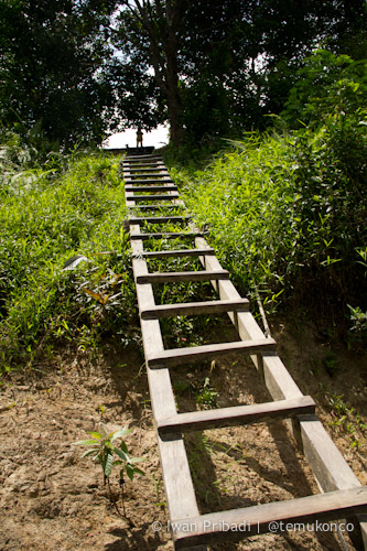 Sebenarnya tidak bisa sepenuhnya dibilang “jalan” sih, karena bentuknya yang berupa tangga sederhana dari kayu ulin dengan kemiringan lebih dari 45 derajat setinggi kurang lebih 100 meter, menempel pada tebing dekat dermaga itu.